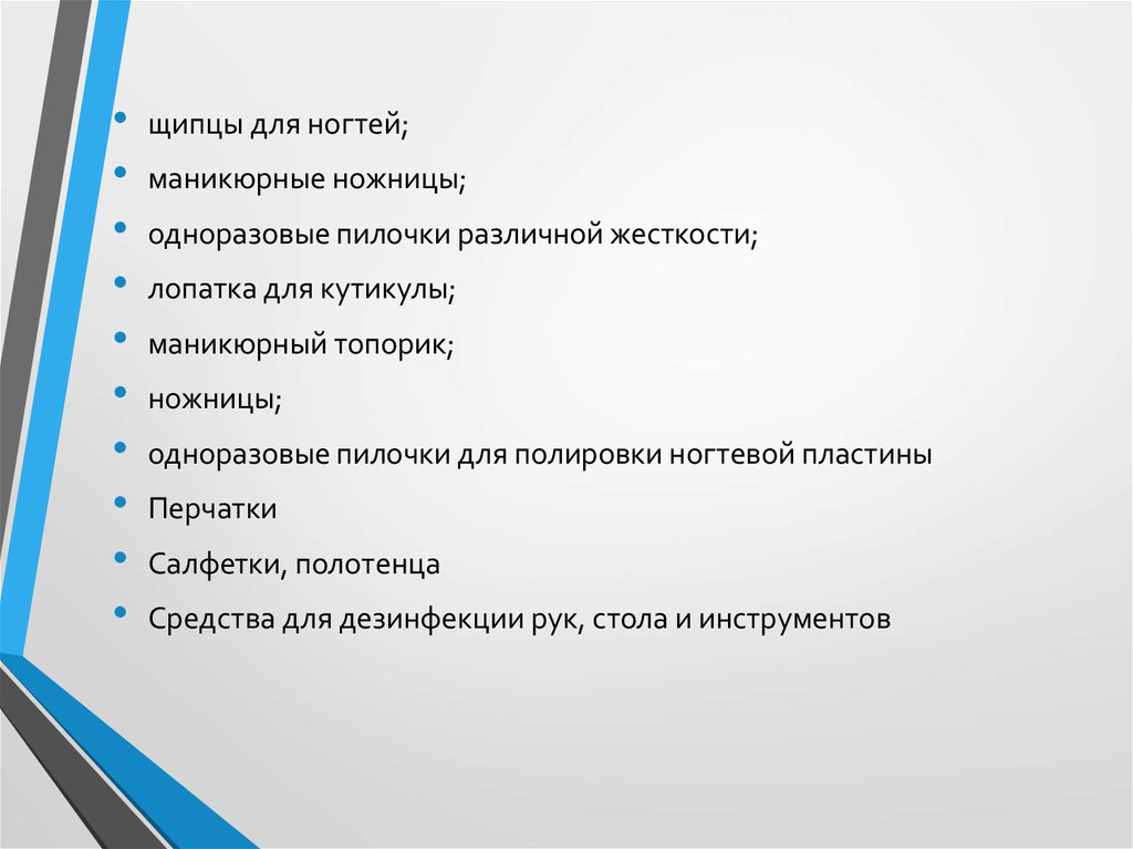 Рабочее место мастера маникюра должно включать след. Предметы…