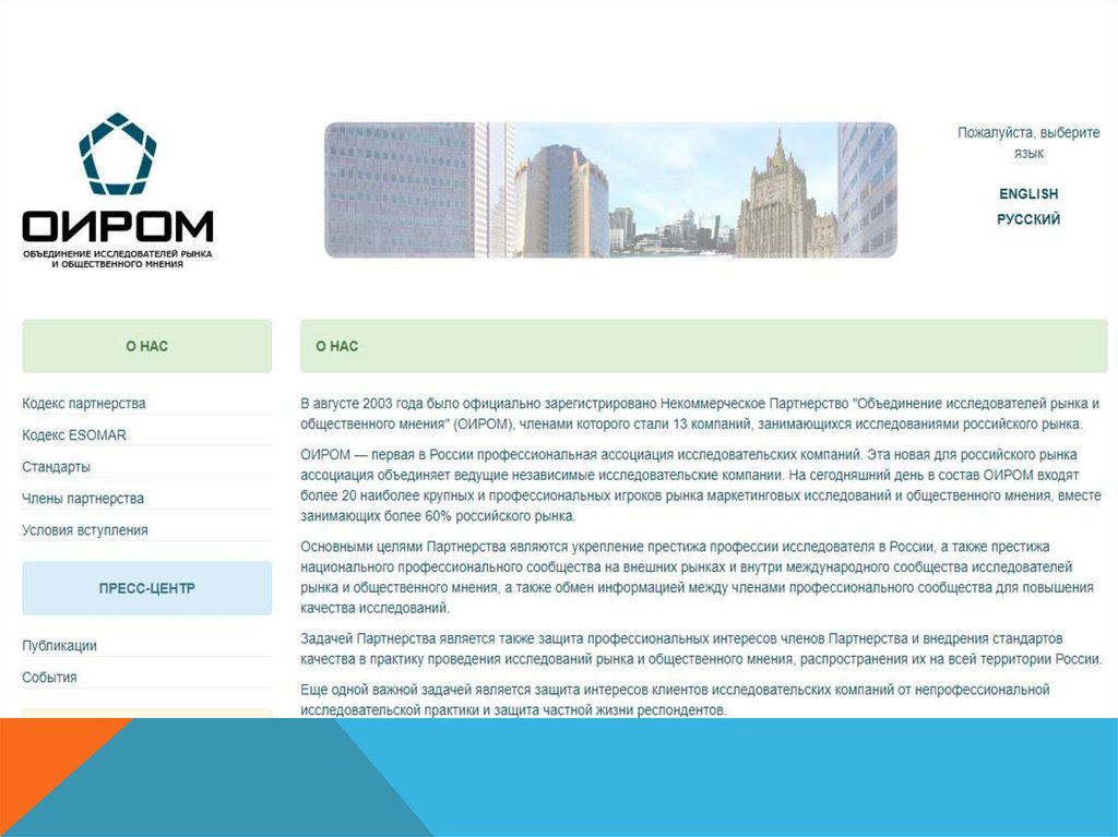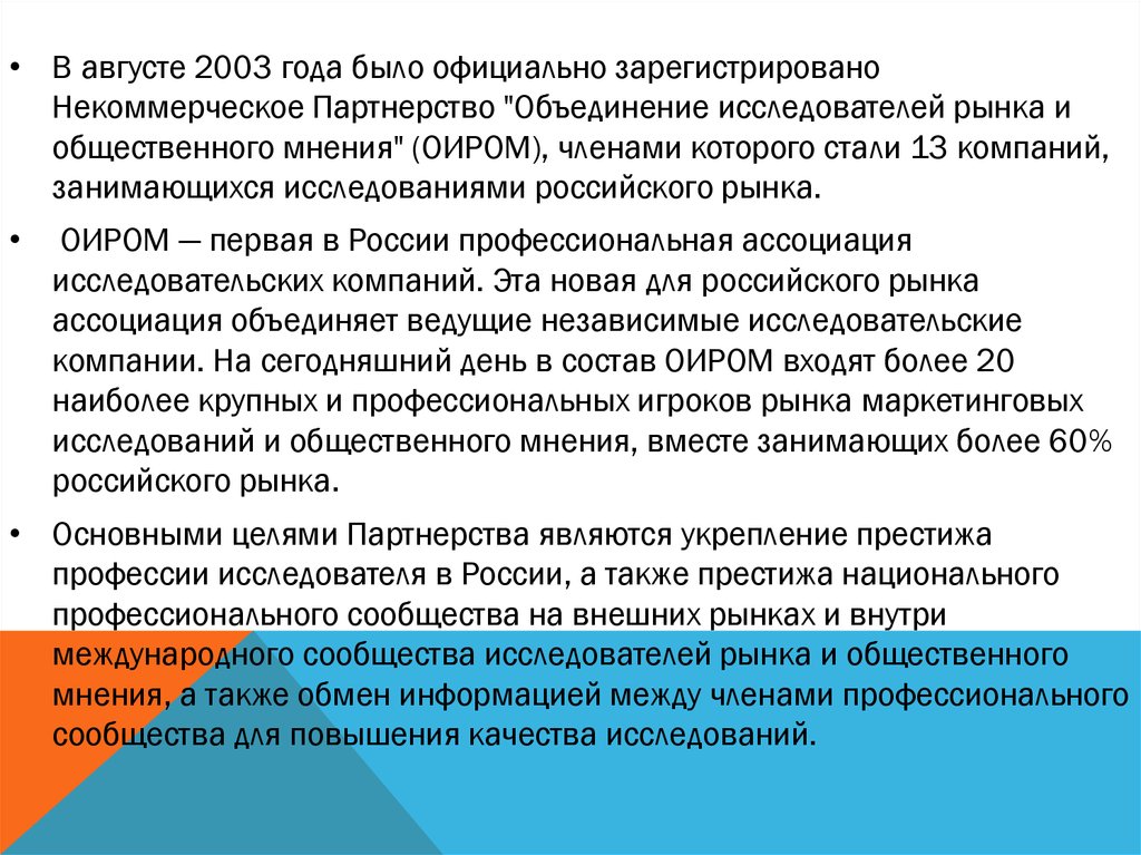 • В августе 2003 года было официально зарегистрированоНекоммерческое Партнерство "Объединение исследователей рынка и