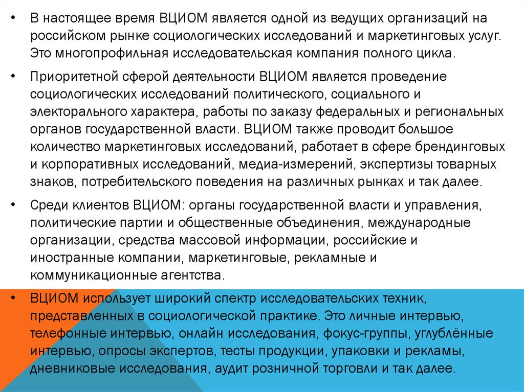 • В настоящее время ВЦИОМ является одной из ведущих организаций нароссийском рынке социологических исследований и маркетинговых услуг.