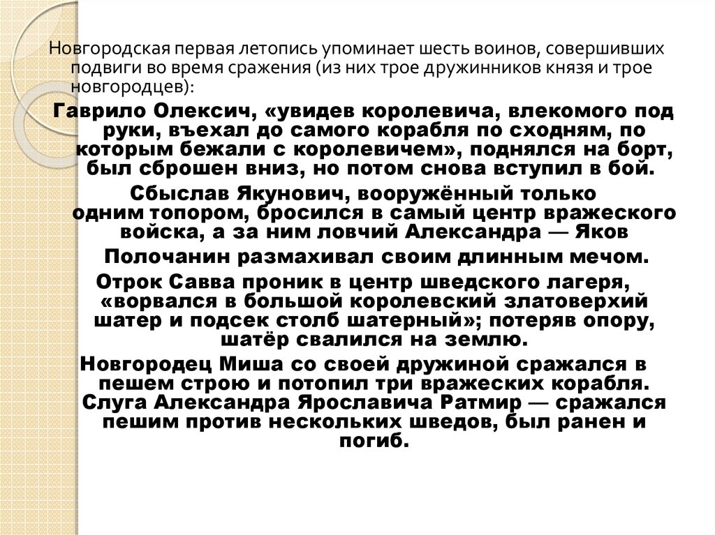 Новгородская первая летопись упоминает шесть воинов, совершившихподвиги во время сражения (из них трое дружинников князя и трое