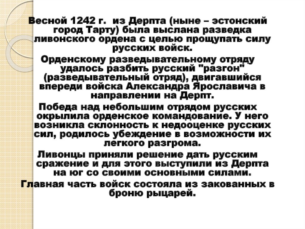 Весной 1242 г. из Дерпта (ныне – эстонскийгород Тарту) была выслана разведка
