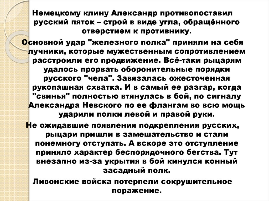 Немецкому клину Александр противопоставилрусский пяток – строй в виде угла, обращённого