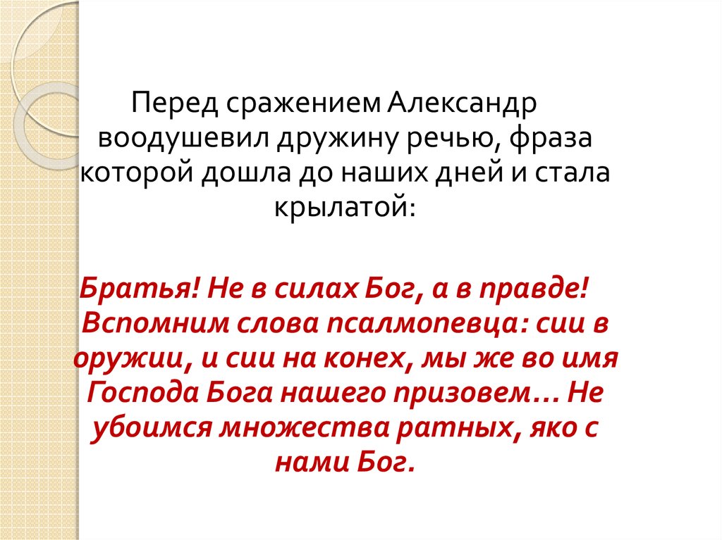 Перед сражением Александрвоодушевил дружину речью, фраза