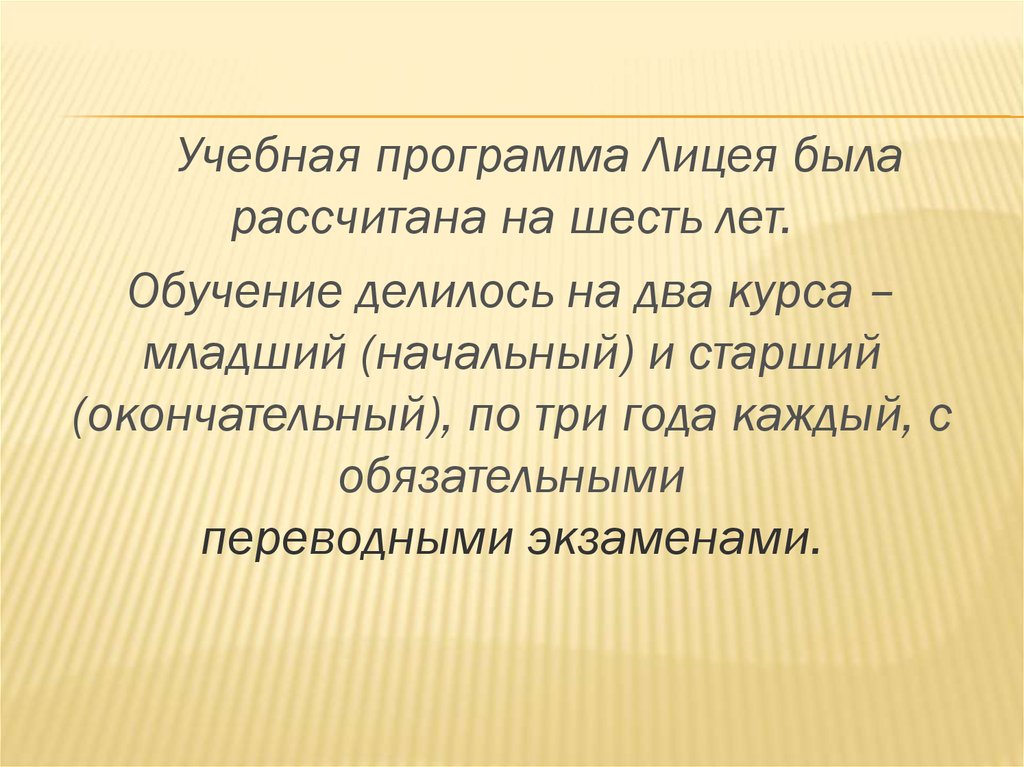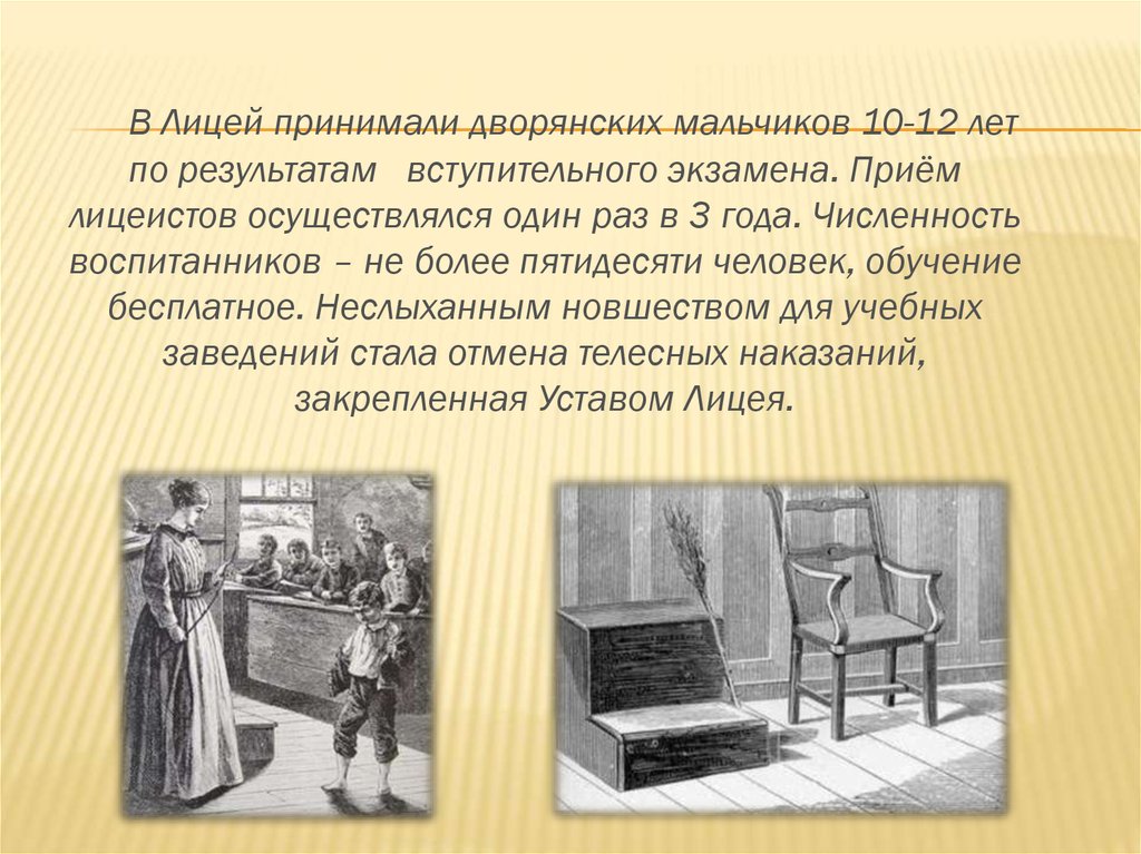В Лицей принимали дворянских мальчиков 10-12 летпо результатам вступительного экзамена. Приём