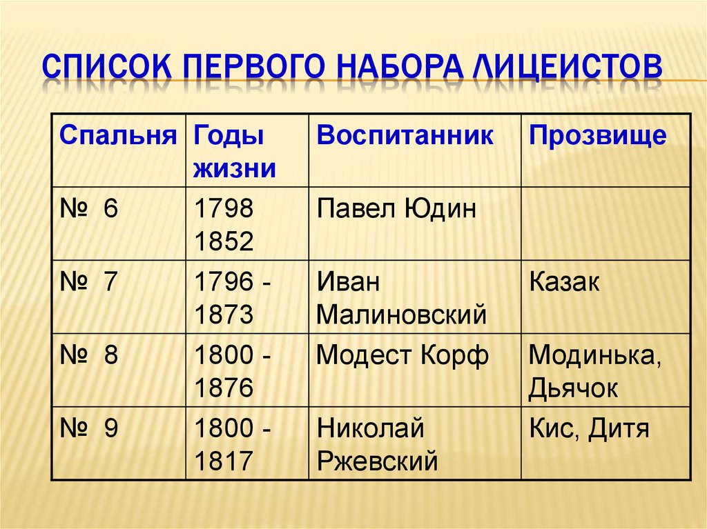 СПИСОК ПЕРВОГО НАБОРА ЛИЦЕИСТОВСпальня Годы