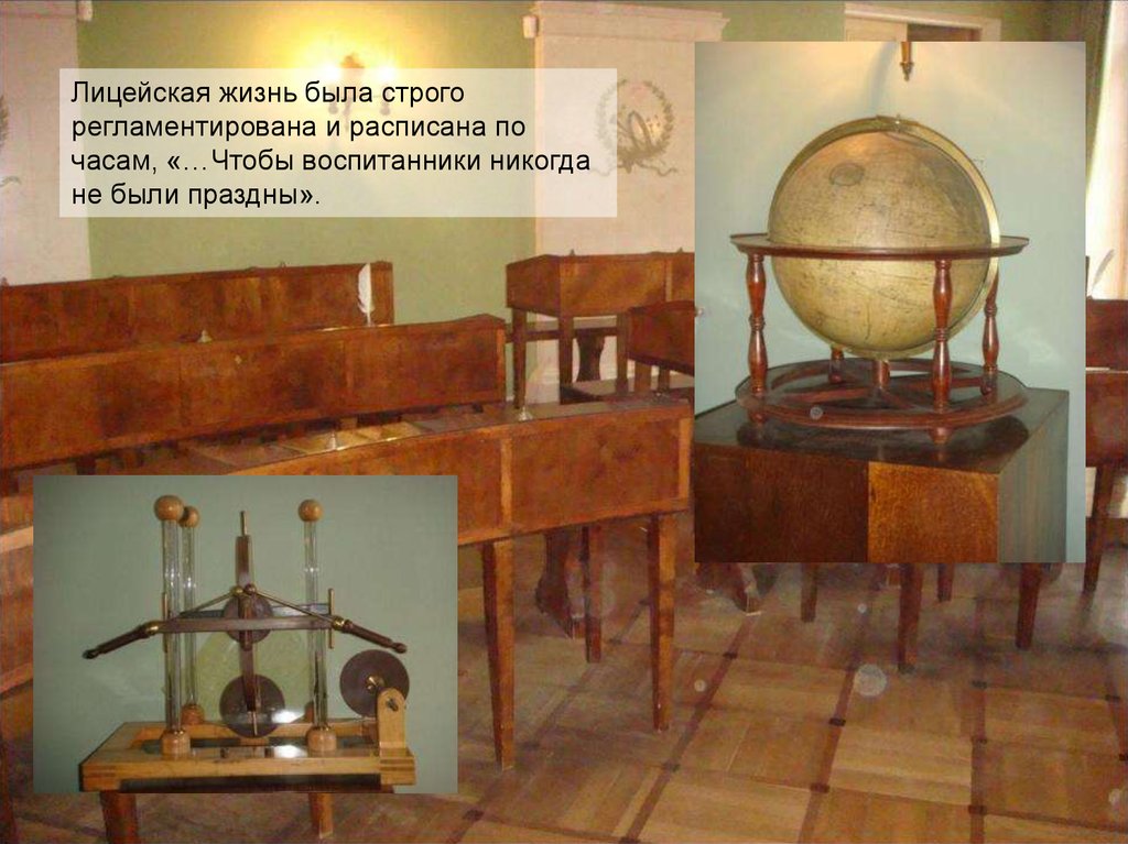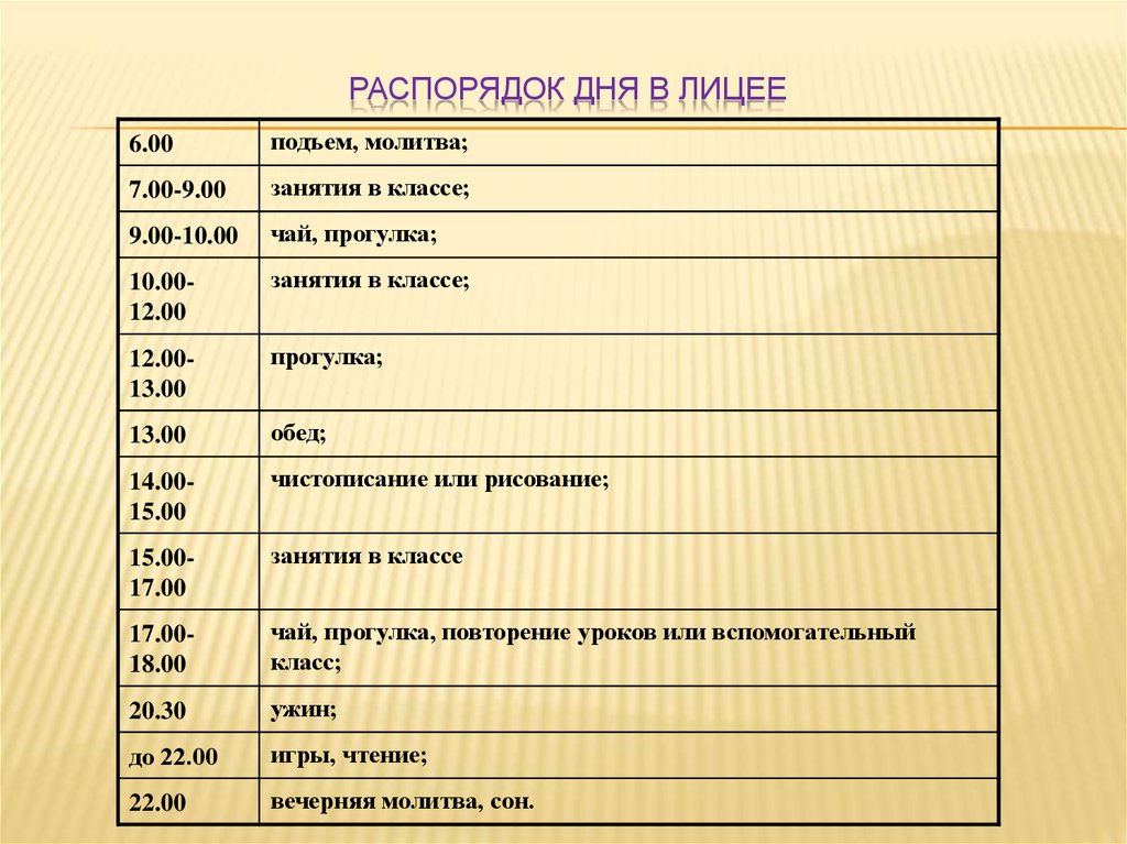 Принятый в Лицее режим дня был тщательно продуман.Одиннадцатимесячный учебный год прерывался лишь в июле,