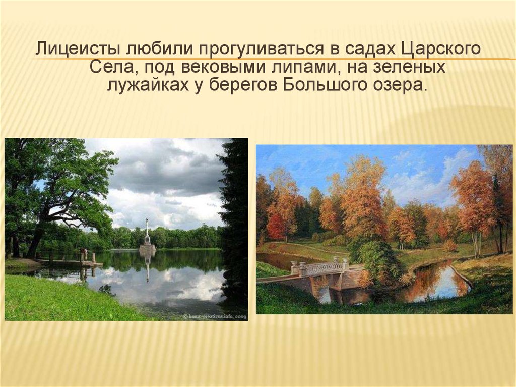 Лицеисты любили прогуливаться в садах ЦарскогоСела, под вековыми липами, на зеленых