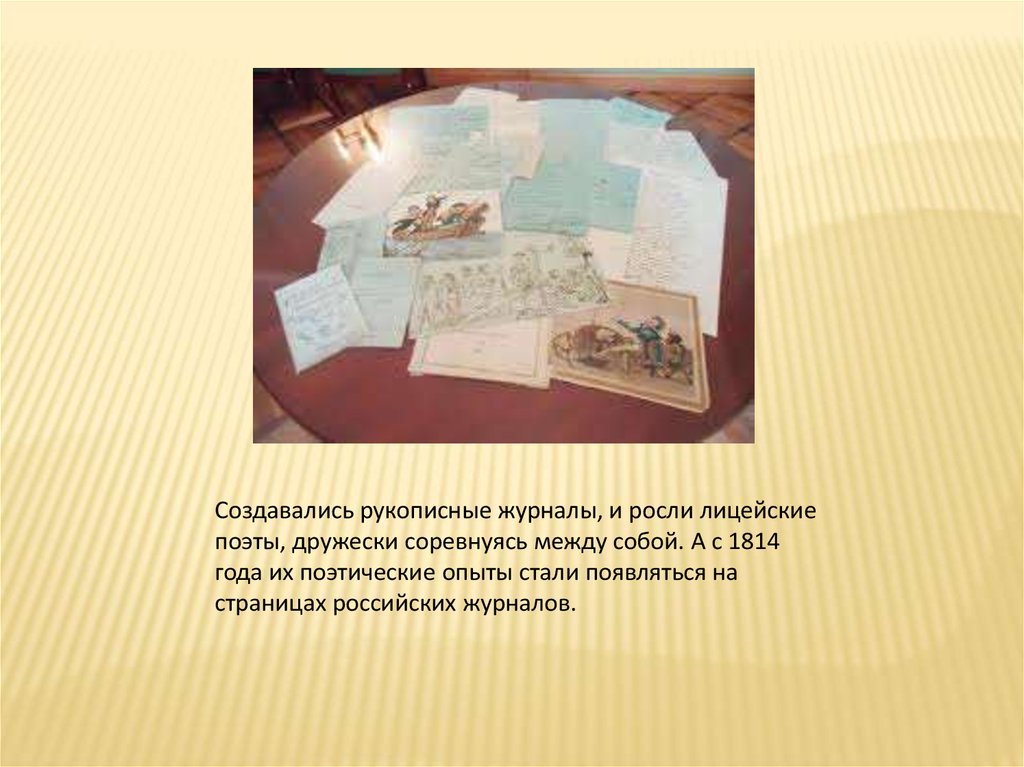 Создавались рукописные журналы, и росли лицейскиепоэты, дружески соревнуясь между собой. А с 1814