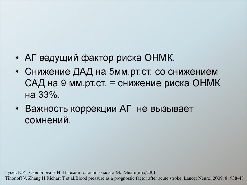 • АГ ведущий фактор риска ОНМК.• Снижение ДАД на 5мм.рт.ст. со снижением