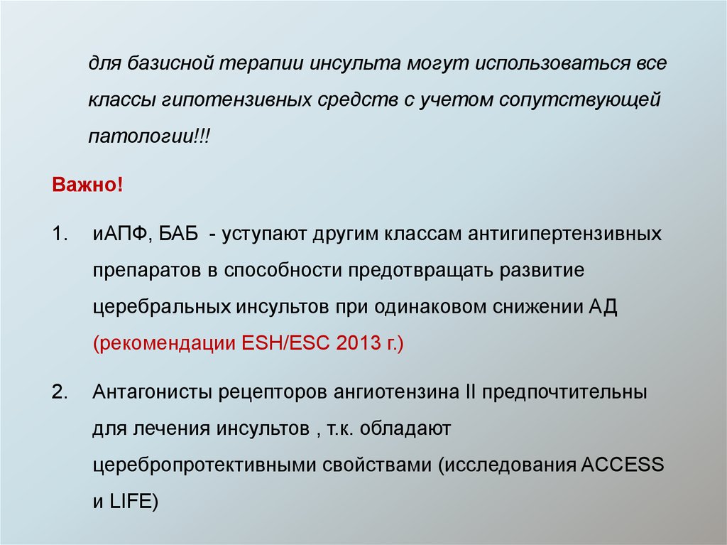 для базисной терапии инсульта могут использоваться всеклассы гипотензивных средств с учетом сопутствующей