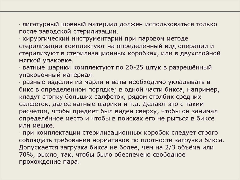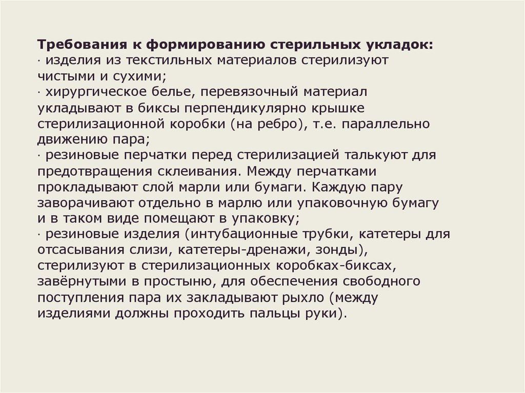 Требования к формированию стерильных укладок:· изделия из текстильных материалов стерилизуют