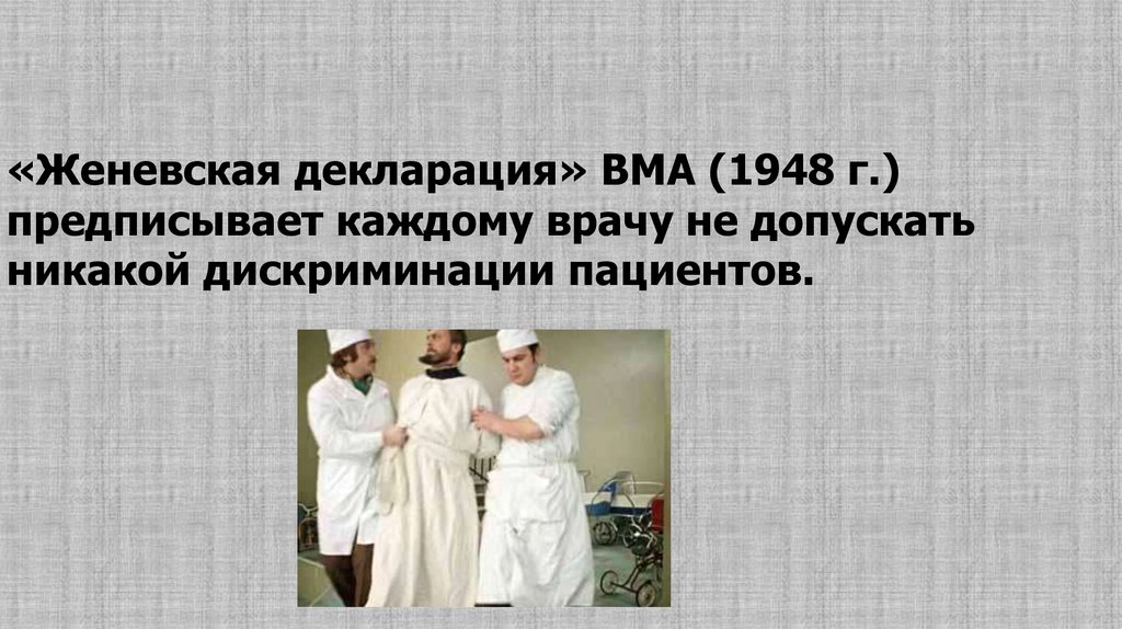 «Женевская декларация» ВМА (1948 г.)предписывает каждому врачу не допускать