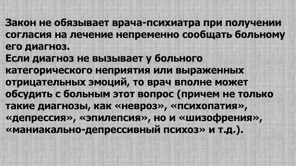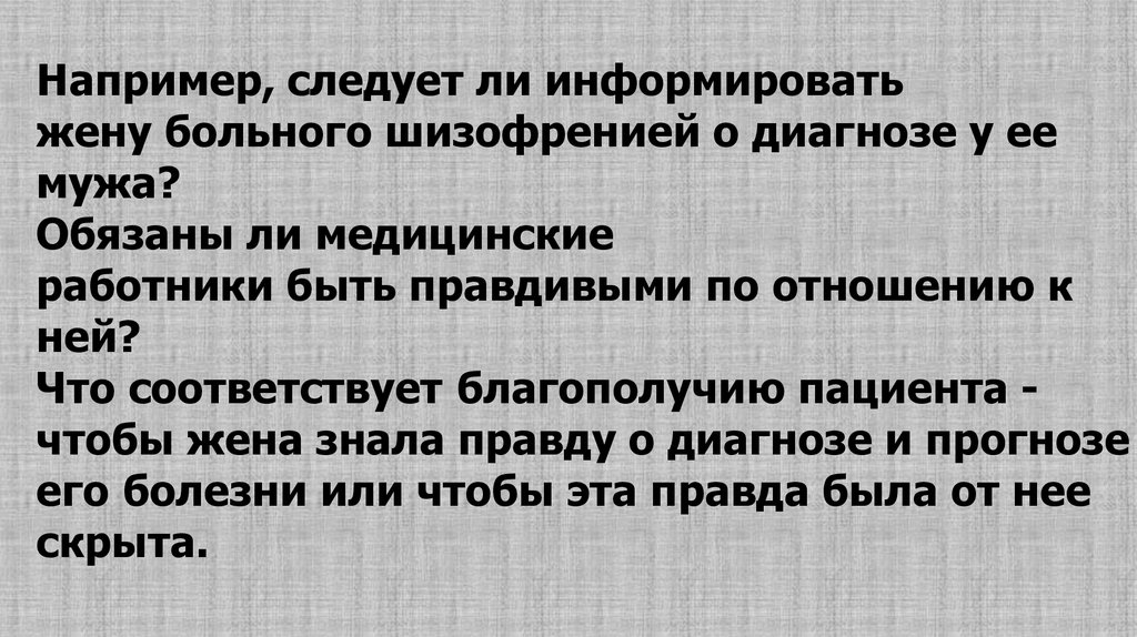 Например, следует ли информироватьжену больного шизофренией о диагнозе у ее