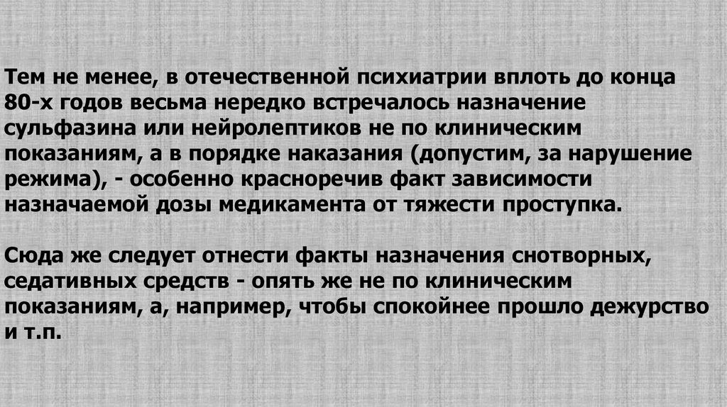 Тем не менее, в отечественной психиатрии вплоть до конца80-х годов весьма нередко встречалось назначение