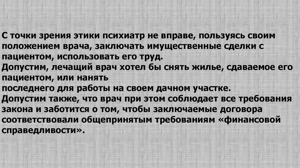 С точки зрения этики психиатр не вправе, пользуясь своимположением врача, заключать имущественные сделки с