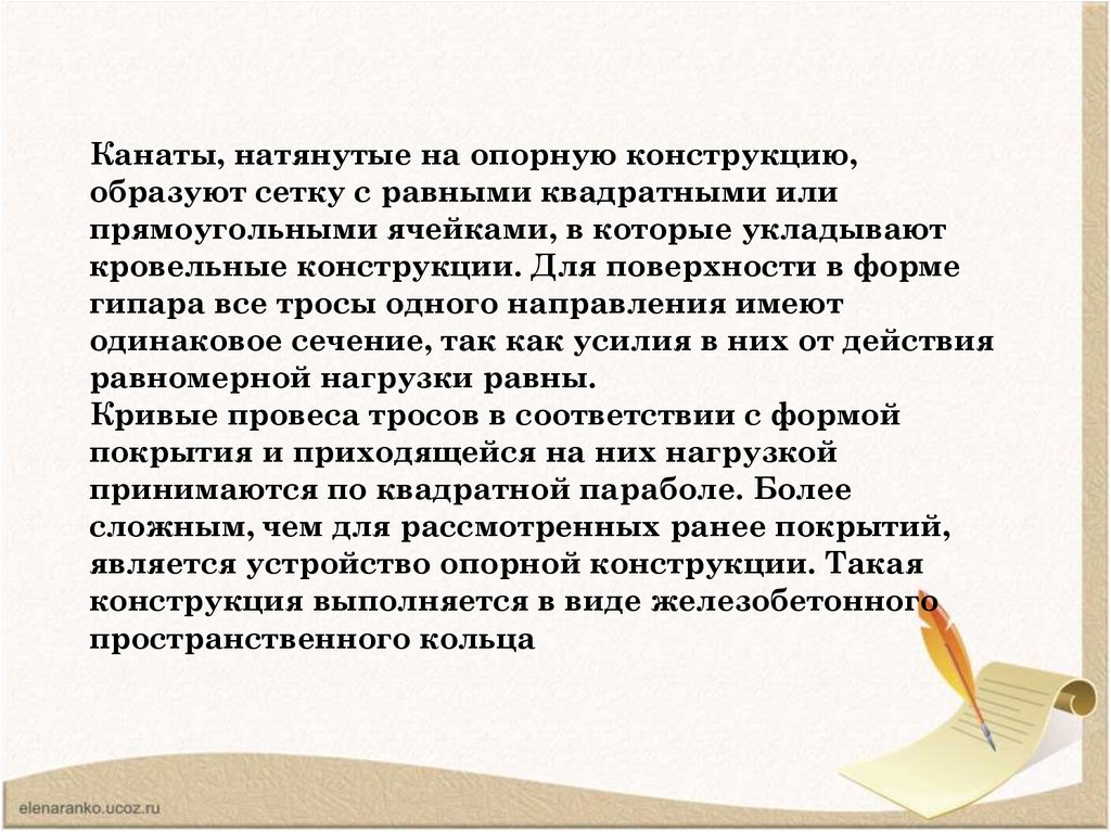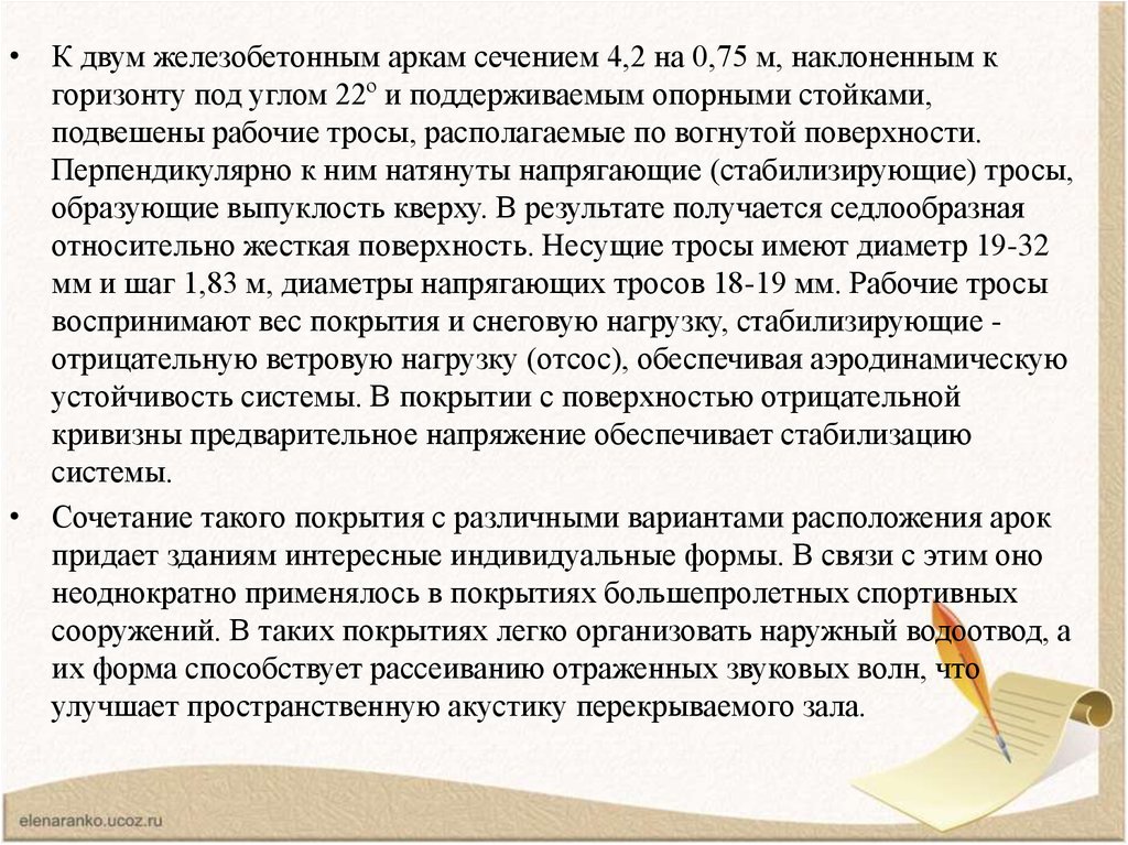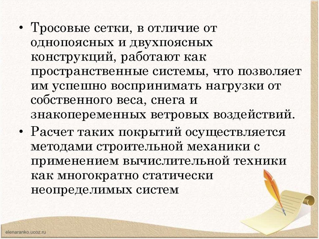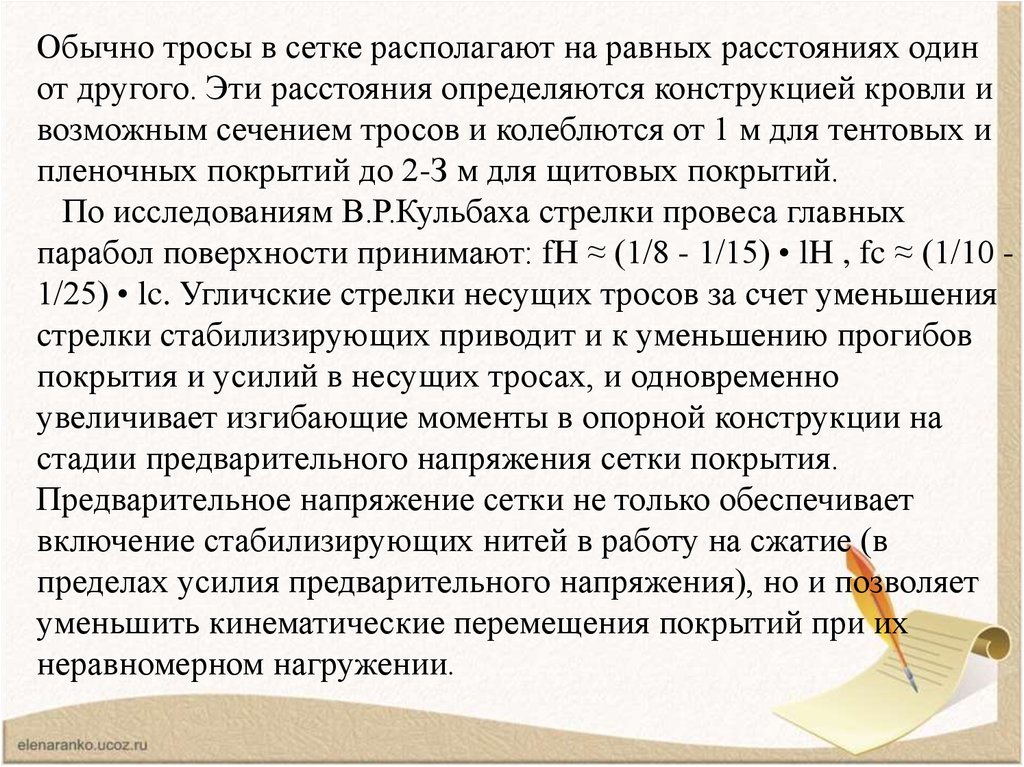 • Работа седловидных сеток отличается также от работыдвухпоясных систем тем, что каждому несущему тросу