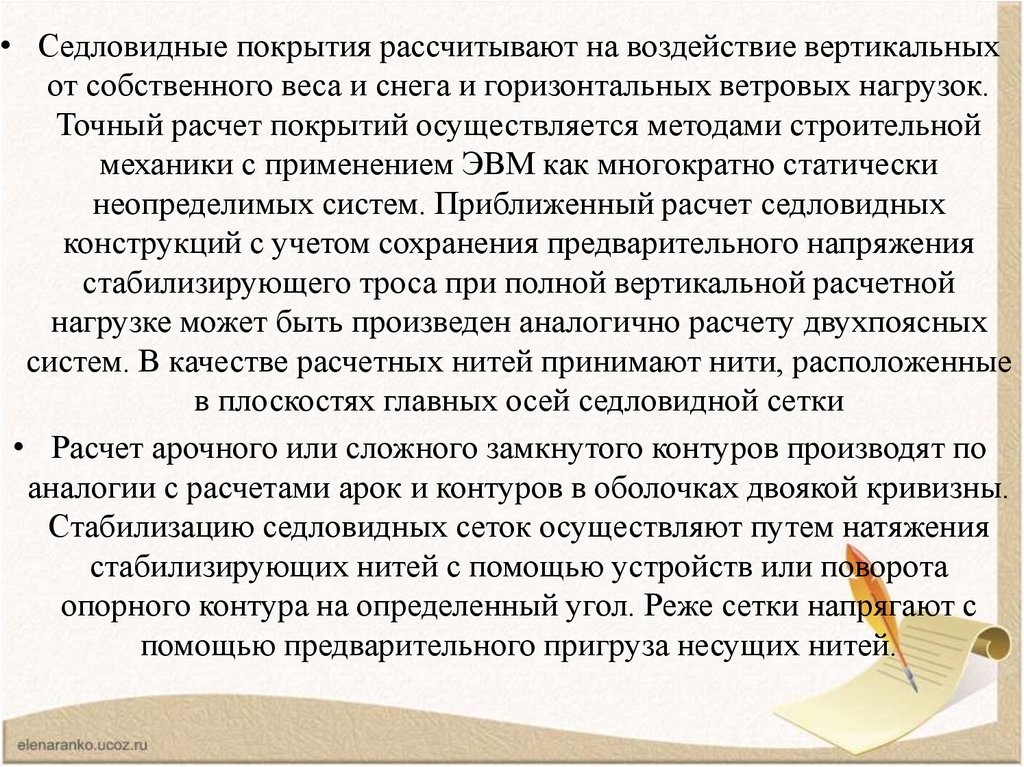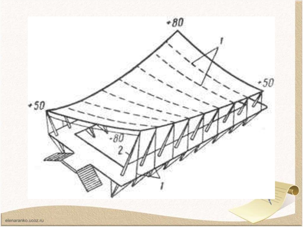 • Седловидные покрытия рассчитывают на воздействие вертикальныхот собственного веса и снега и горизонтальных ветровых нагрузок.