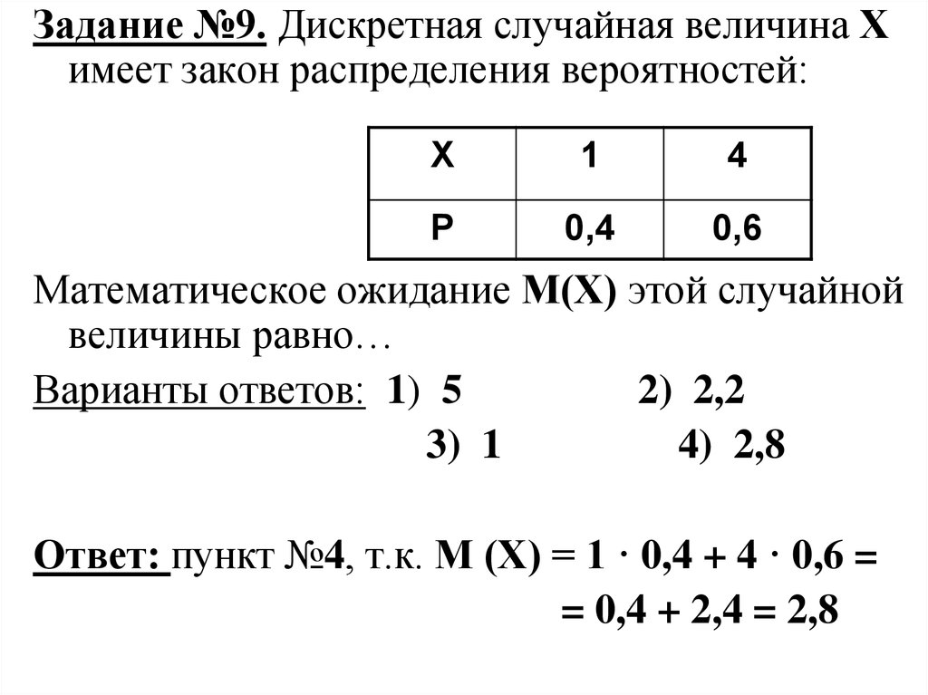 Ответ: пункт №4, т.к. М (Х) = 1 · 0,4 + 4 · 0,6 =