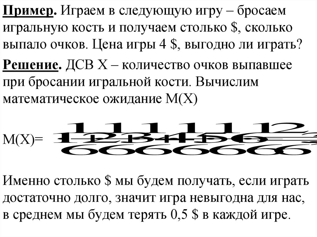 Пример. Играем в следующую игру – бросаемигральную кость и получаем столько $, сколько