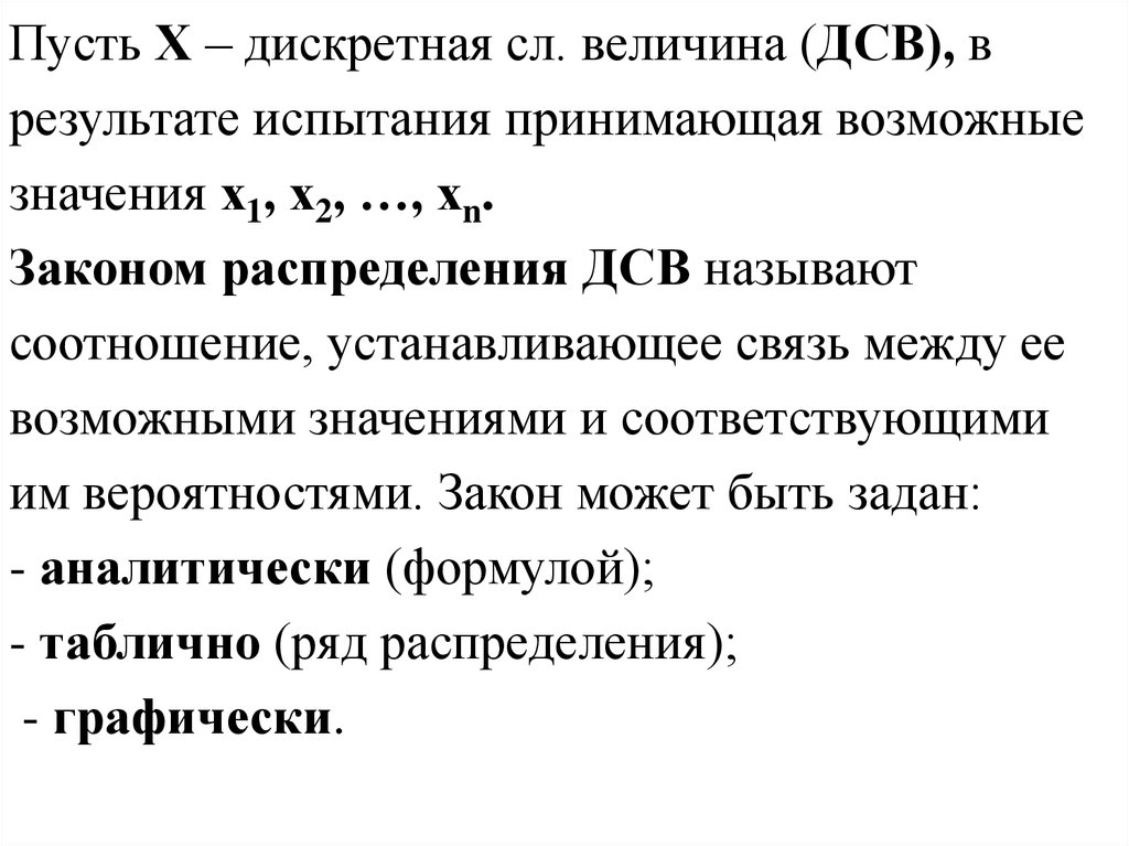 Пусть Х – дискретная сл. величина (ДСВ), врезультате испытания принимающая возможные