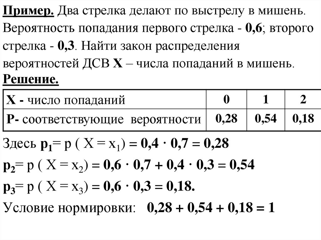 Пример. Два стрелка делают по выстрелу в мишень.Вероятность попадания первого стрелка - 0,6; второго