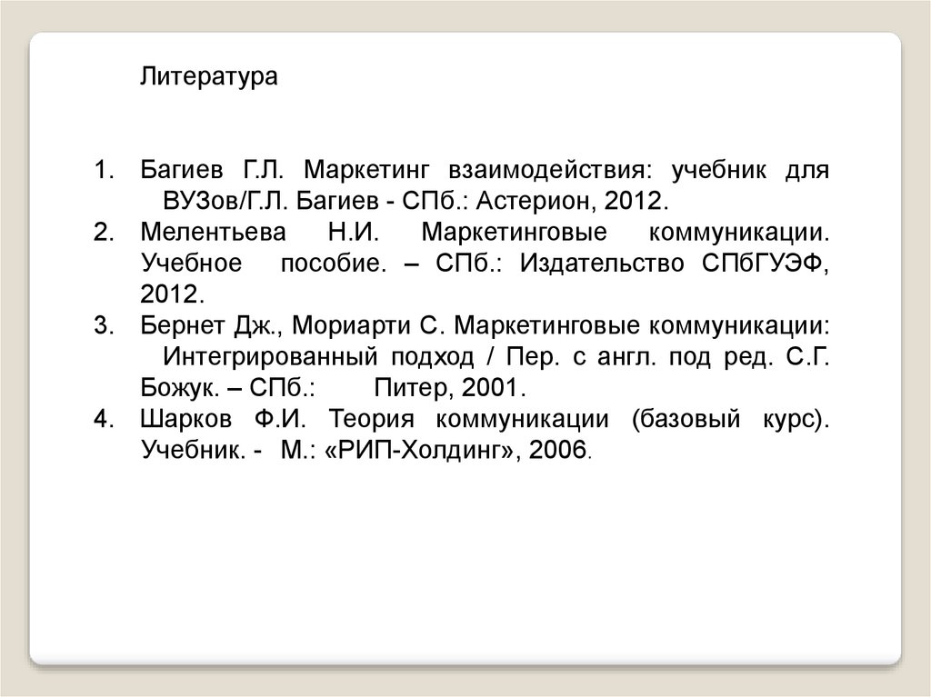 Литература1. Багиев Г.Л. Маркетинг взаимодействия: учебник для