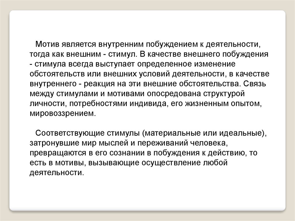 Мотив является внутренним побуждением к деятельности,тогда как внешним - стимул. В качестве внешнего побуждения