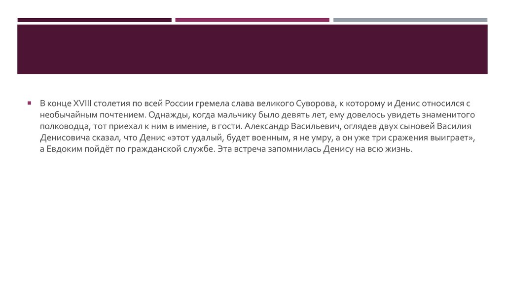 В конце XVIII столетия по всей России гремела слава великого Суворова, к которому и Денис относился снеобычайным почтением. Однажды, когда мальчику было девять лет, ему довелось увидеть знаменитого