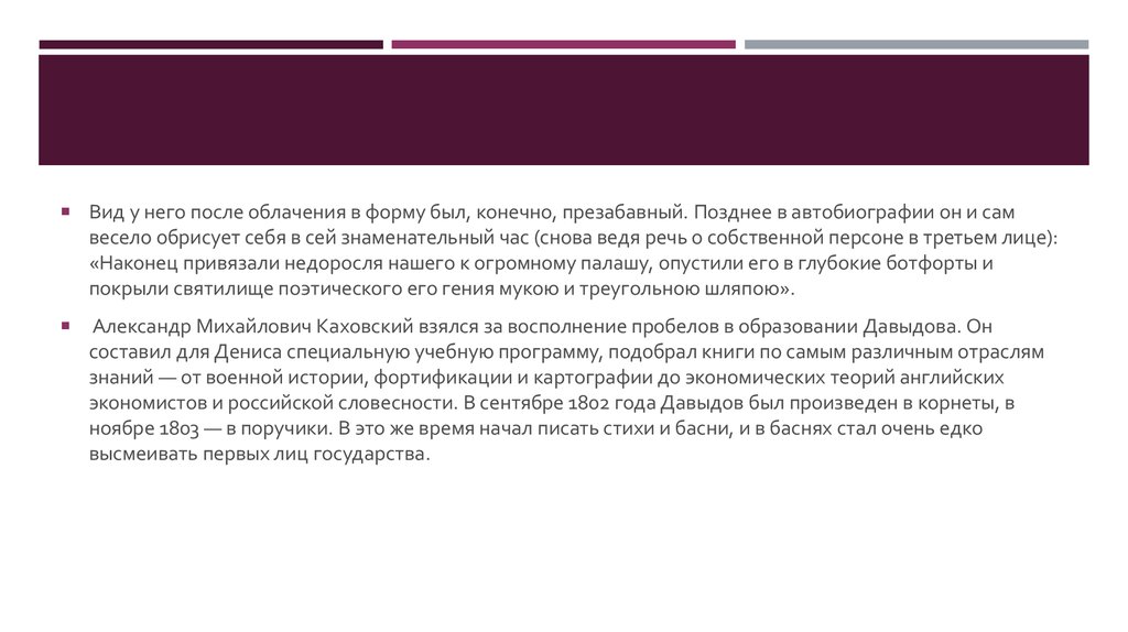экономистов и российской словесности. В сентябре 1802 года Давыдов был произведен в корнеты, в