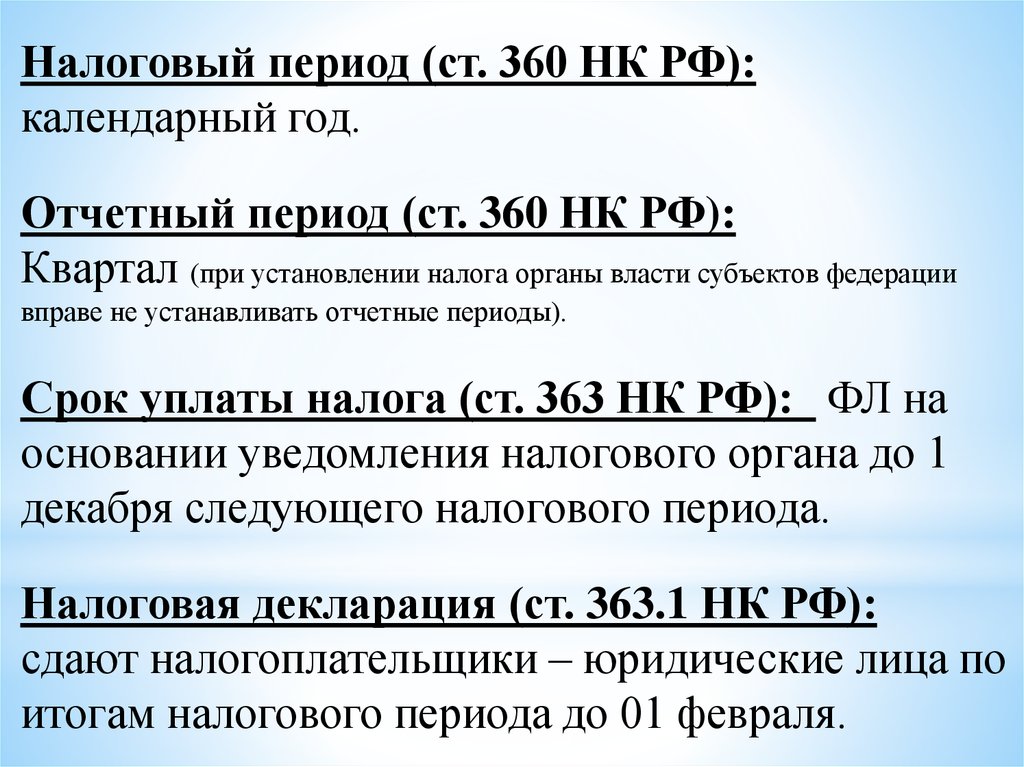 Налоговый период (ст. 360 НК РФ):календарный год.