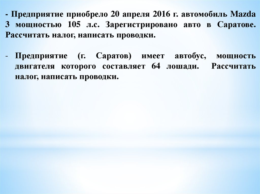 - Предприятие приобрело 20 апреля 2016 г. автомобиль Mazda3 мощностью 105 л.с. Зарегистрировано авто в Саратове.