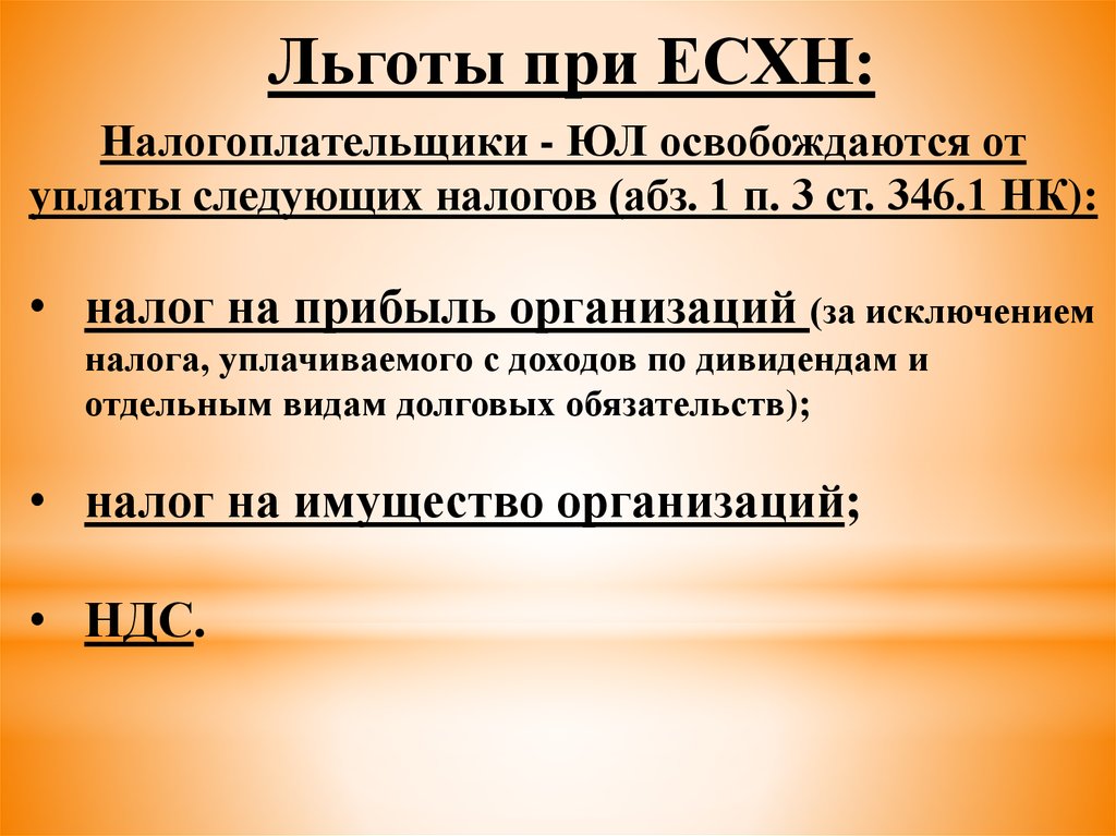 Льготы при ЕСХН:Налогоплательщики - ЮЛ освобождаются от