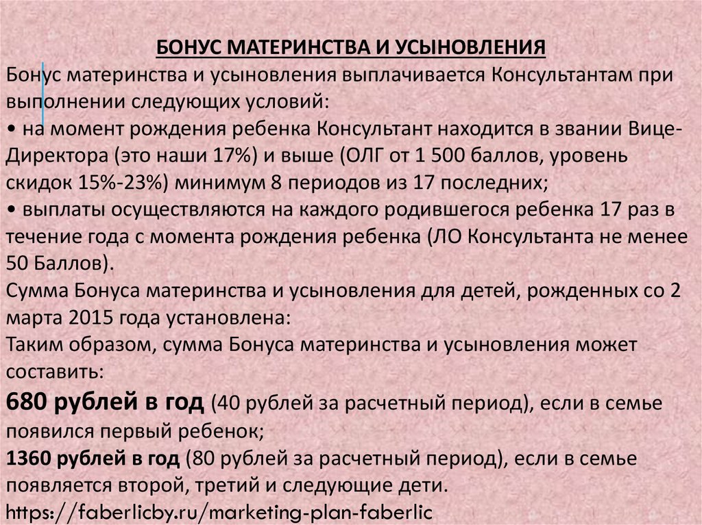 БОНУС МАТЕРИНСТВА И УСЫНОВЛЕНИЯБонус материнства и усыновления выплачивается Консультантам при