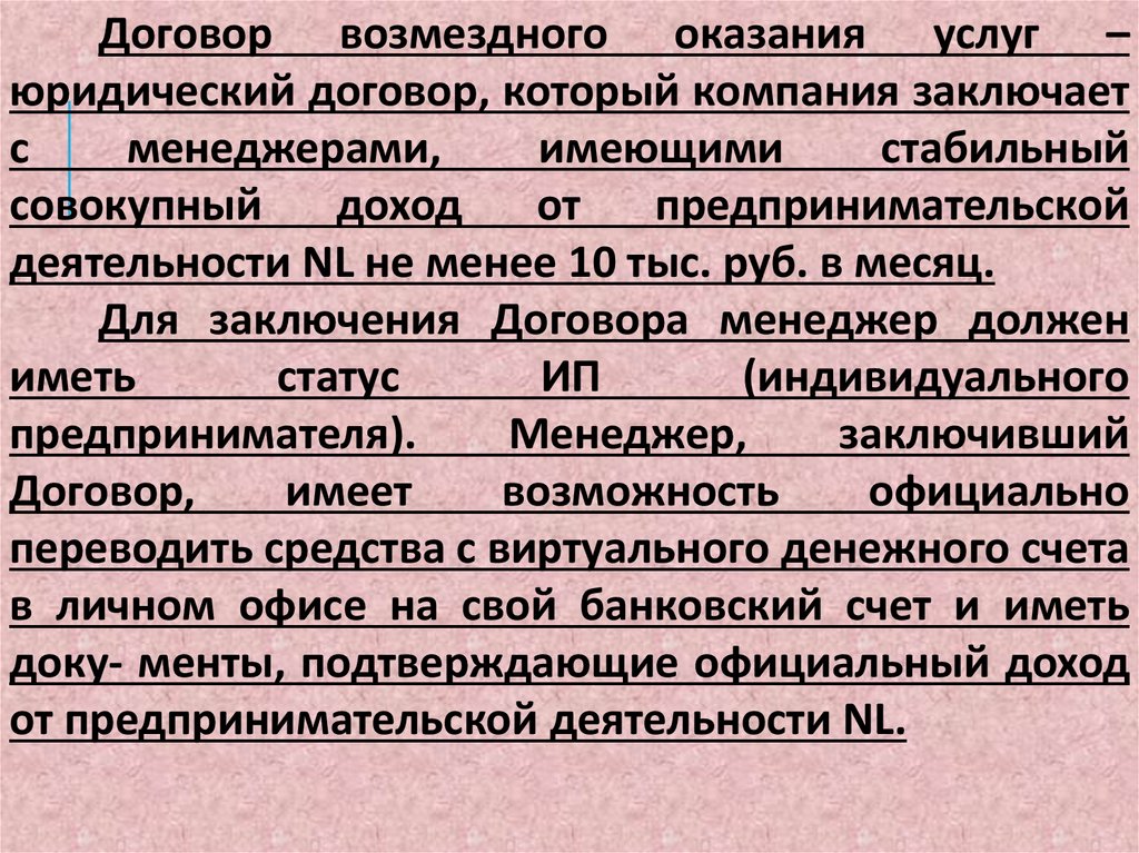 деятельности NL не менее 10 тыс. руб. в месяц.