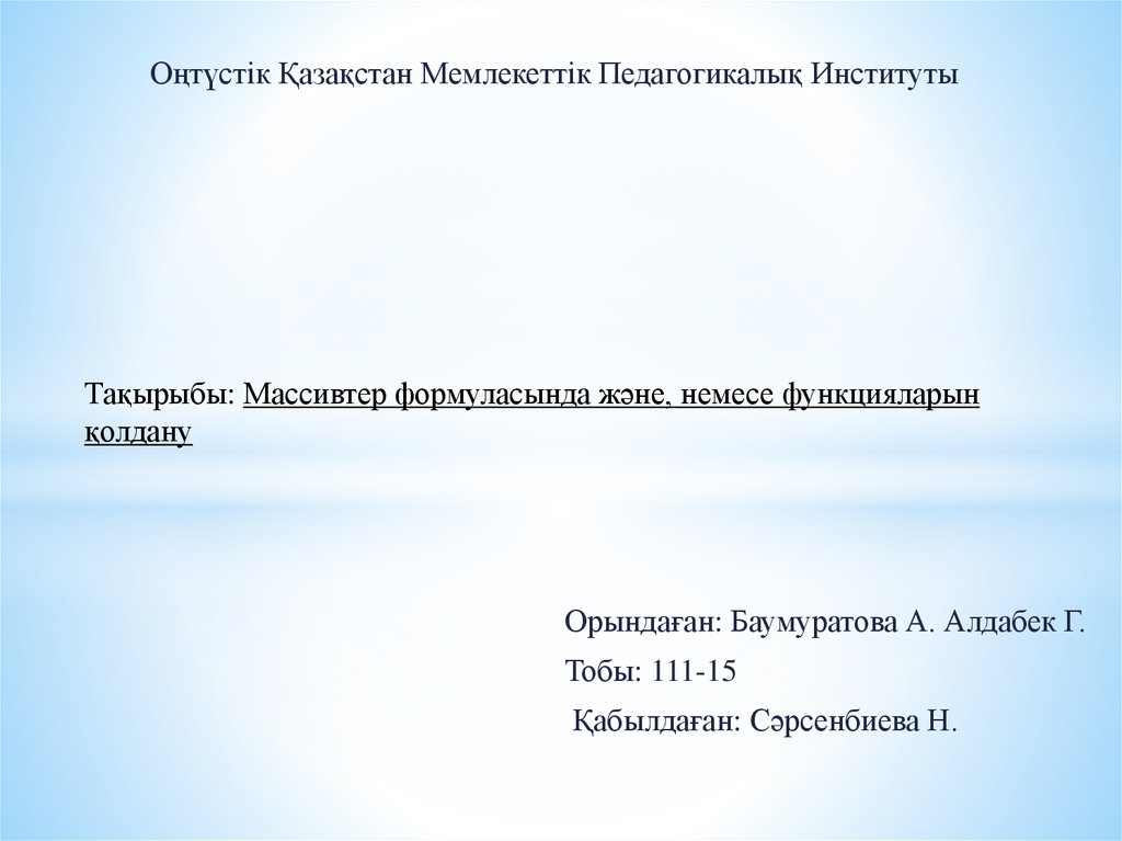 Оңтүстік Қазақстан Мемлекеттік Педагогикалық ИнститутыТақырыбы: Массивтер формуласында және, немесе функцияларын