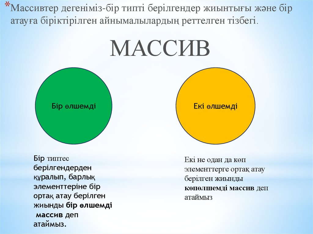 *Массивтер дегеніміз-бір типті берілгендер жиынтығы және біратауға біріктірілген айнымалылардың реттелген тізбегі.