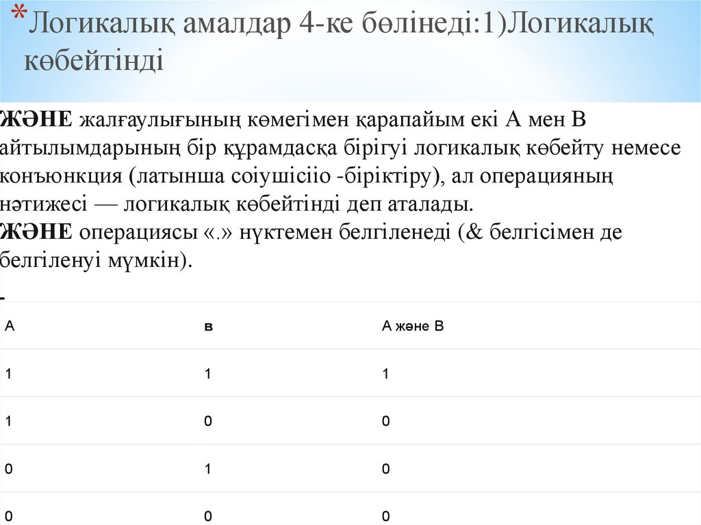 *Логикалық амалдар 4-ке бөлінеді:1)Логикалықкөбейтінді