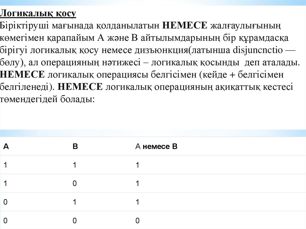 Логикалық қосуБіріктіруші мағынада қолданылатын НЕМЕСЕ жалғаулығының