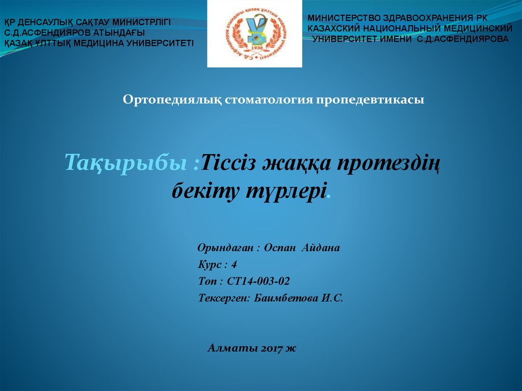 Тақырыбы :Тіссіз жаққа протездің