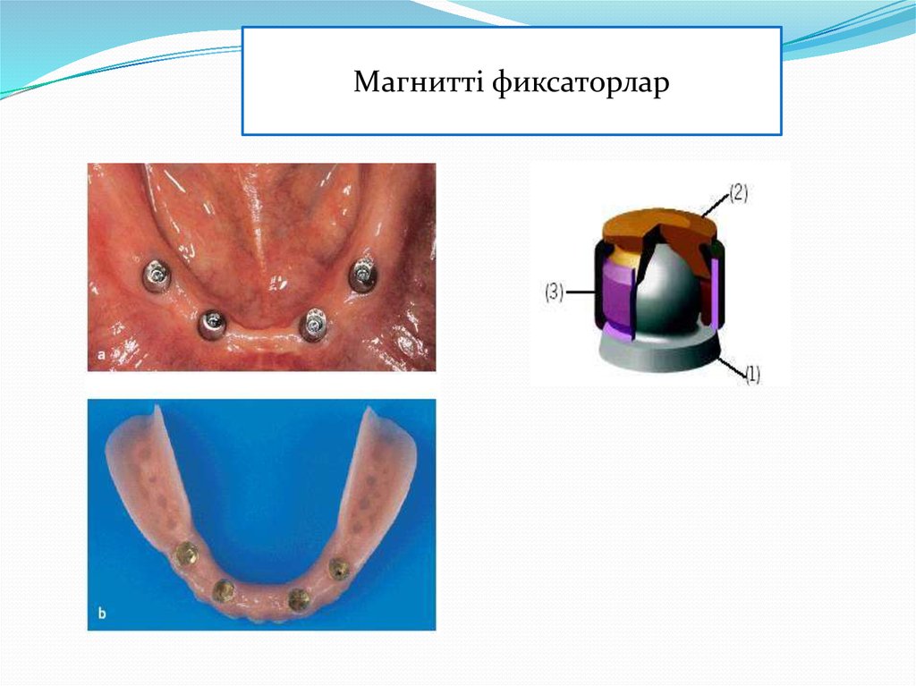 Фиксациялаудың қосымша әдістері.Бұл магниттер, имплотанттар және басқа да
