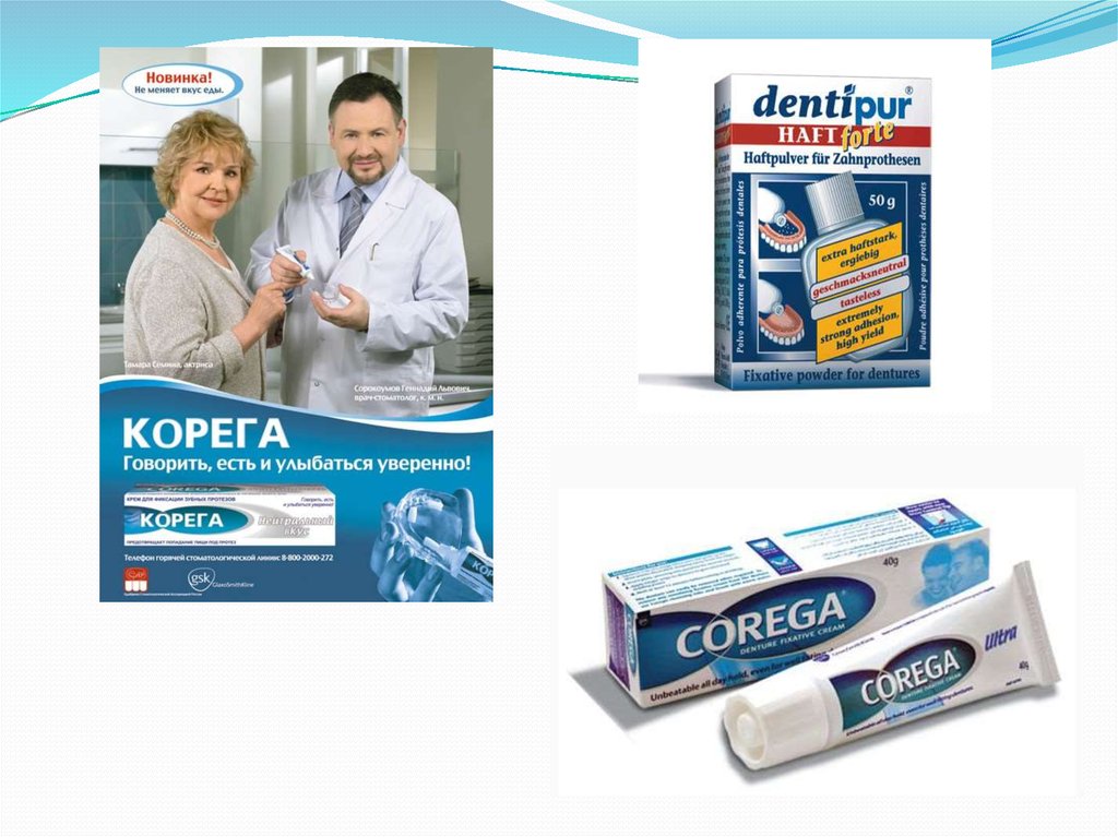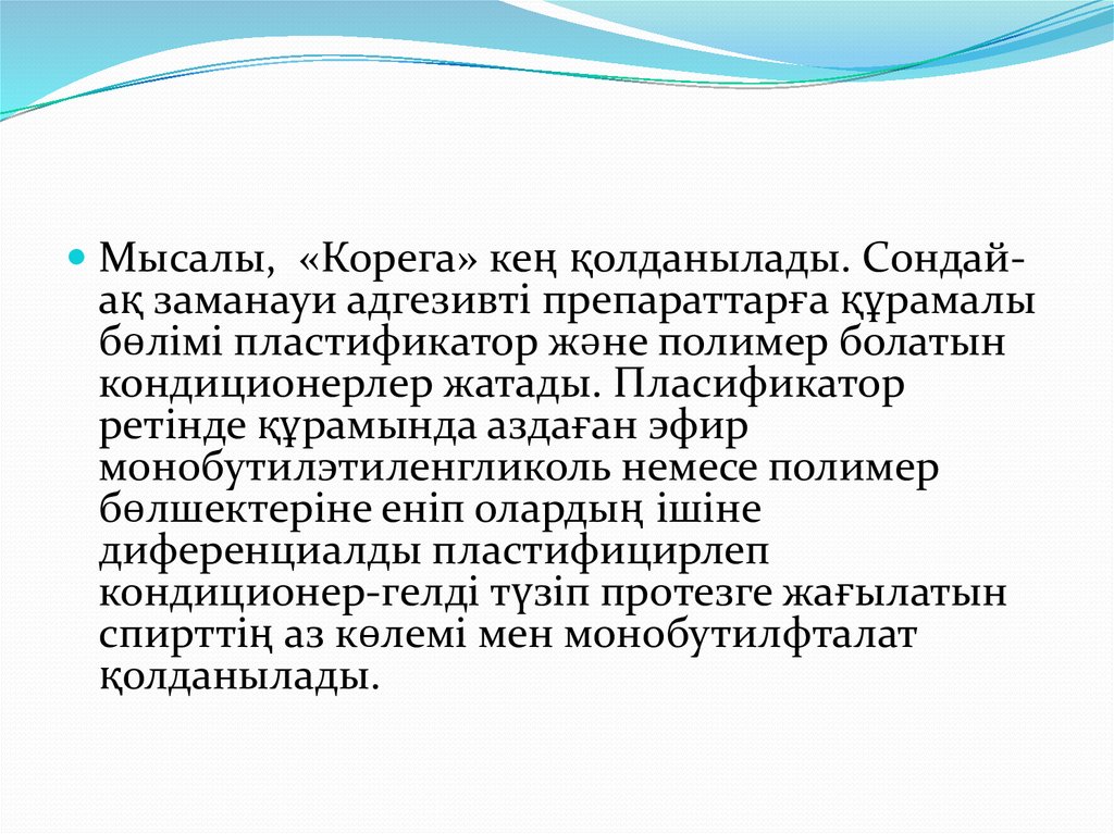 Мысалы, «Корега» кең қолданылады. Сондайақ заманауи адгезивті препараттарға құрамалыбөлімі пластификатор және полимер болатын