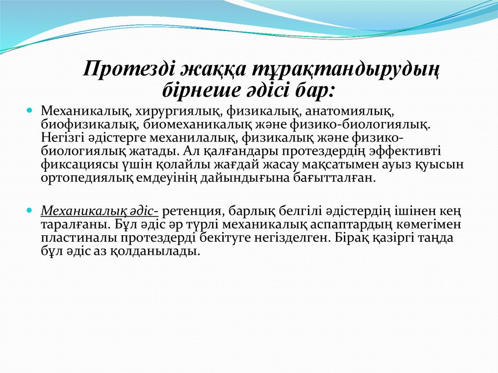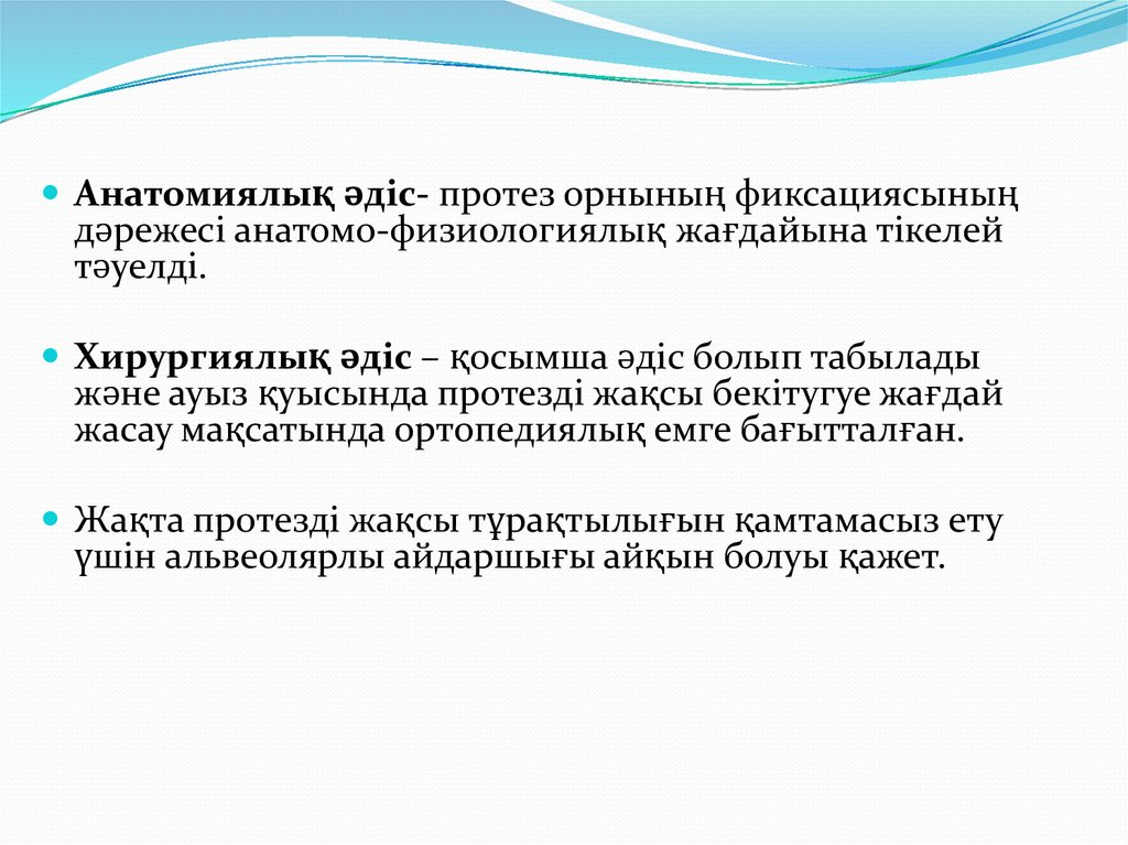 Анатомиялық әдіс- протез орнының фиксациясыныңдәрежесі анатомо-физиологиялық жағдайына тікелей