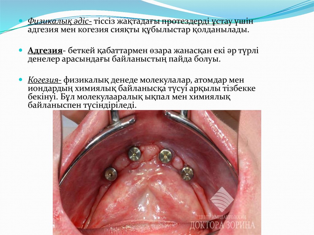 Физикалық әдіс- тіссіз жақтадағы протездерді ұстау үшінадгезия мен когезия сияқты құбылыстар қолданылады.