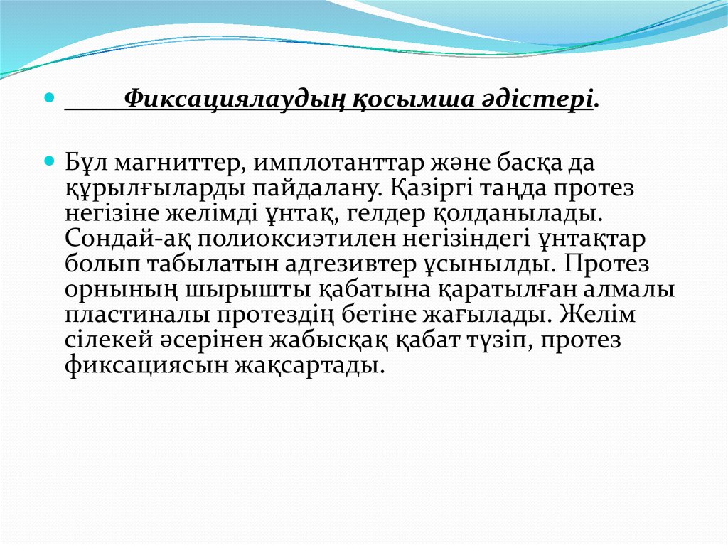 2. Фиксация Тіссіз жақтардағы протездердің функционалдық құндылығы бірінші кезекте протездердің фиксациясына , яғни олардың