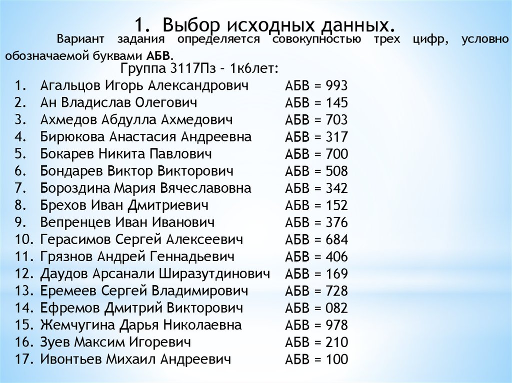 1. Выбор исходных данных.Группа 3117Пз – 1к6лет: