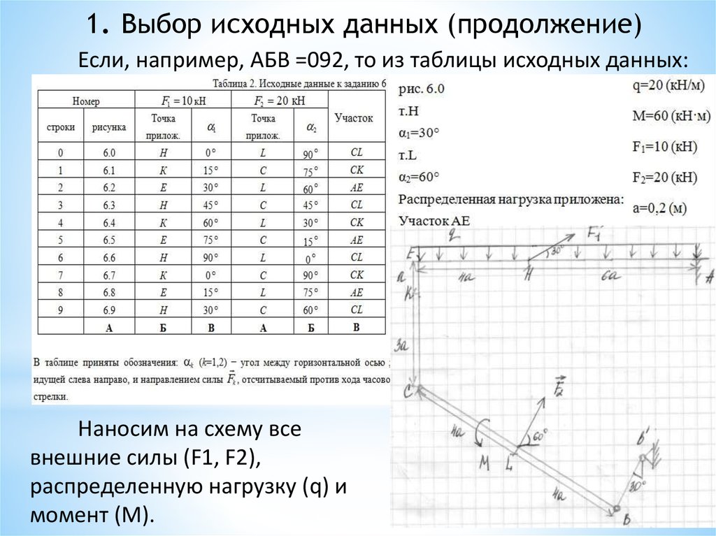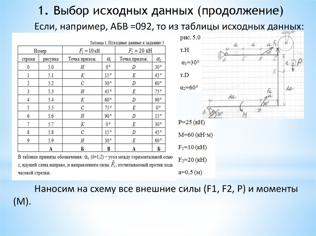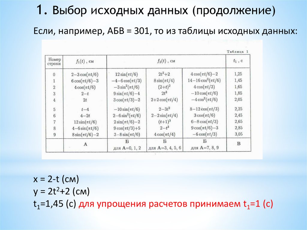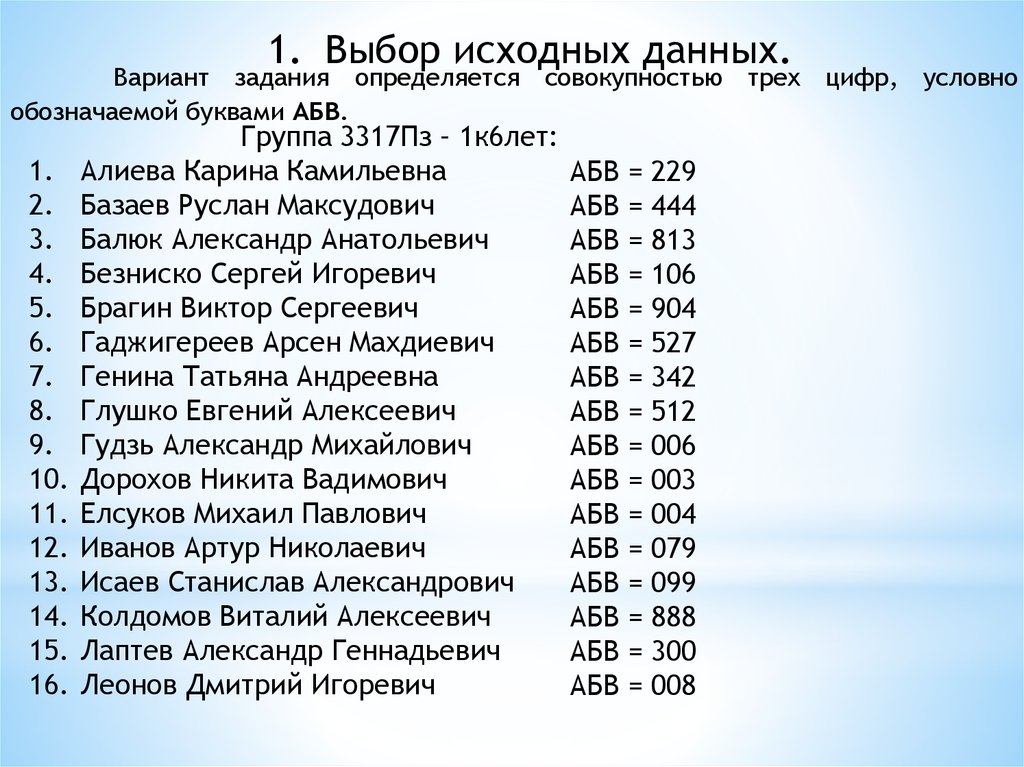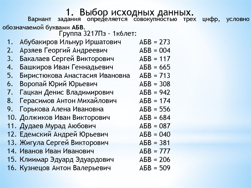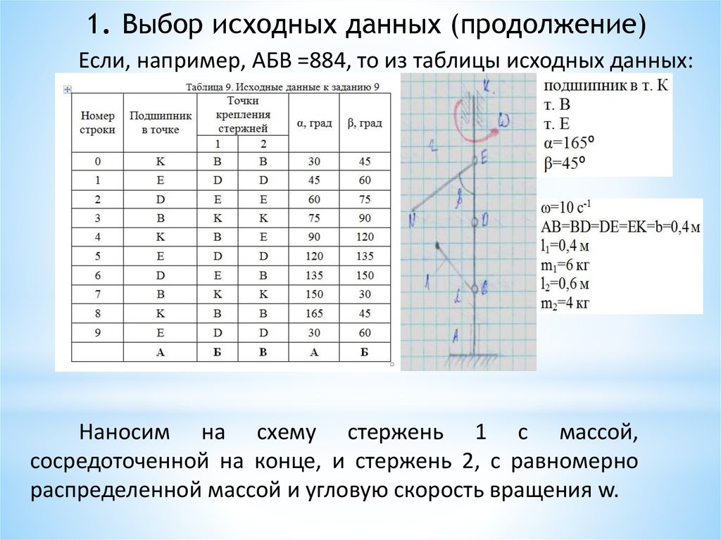 1. Выбор исходных данных (продолжение)Если, например, АБВ =884, то из таблицы исходных данных: