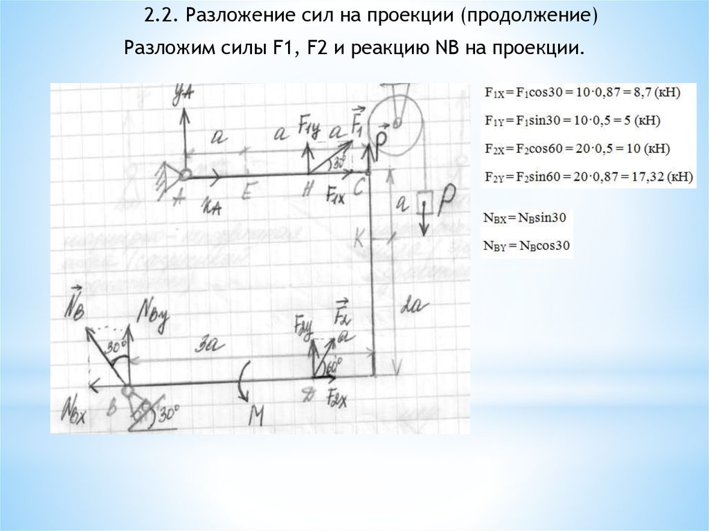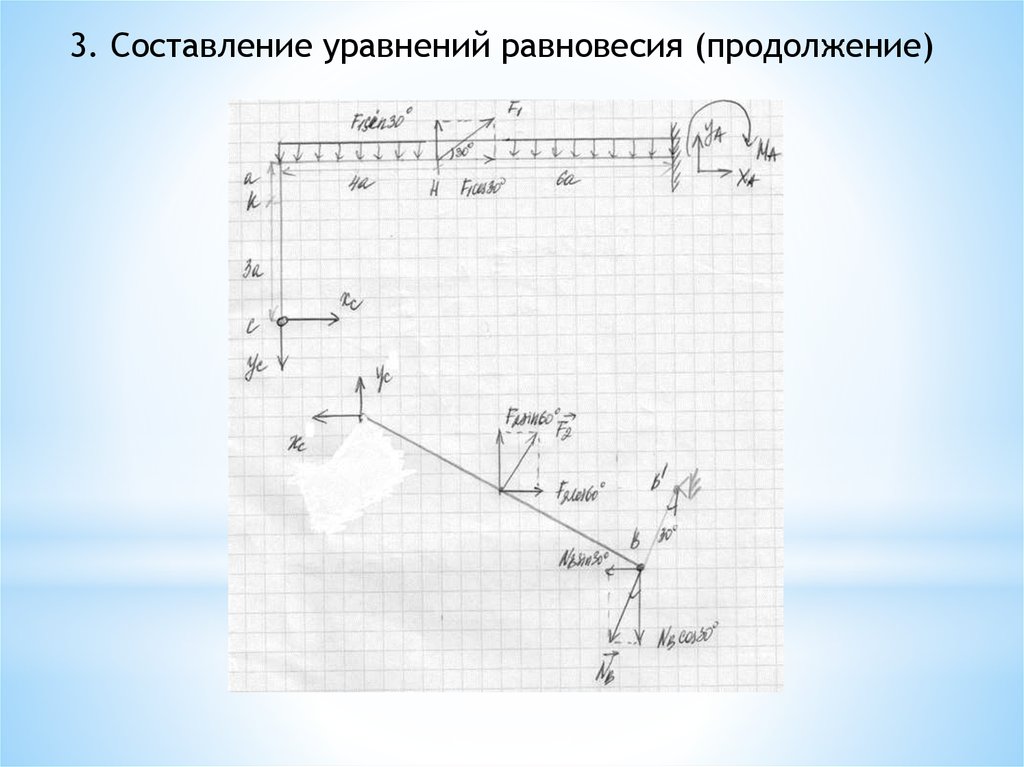 2. Нанесение на схему веса груза P, силыдавления N, силы трения Fтр и координатных