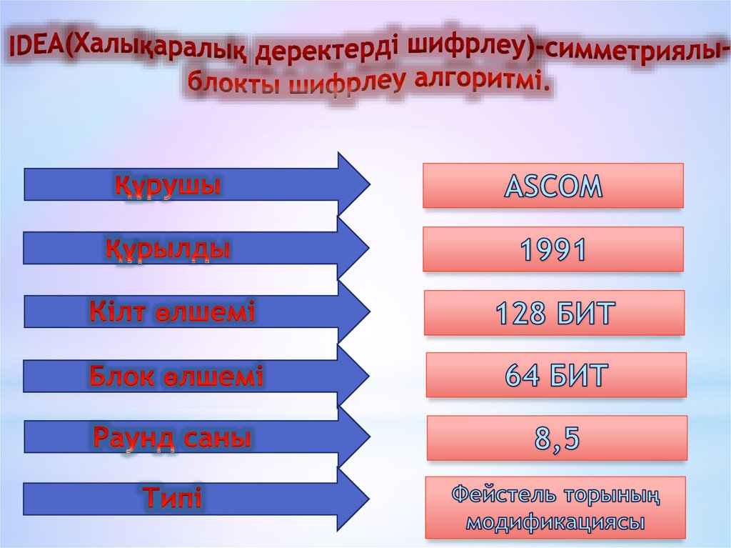 20. IDEA алгоритмінде 64 биттік блоктарды пайдаланады. Блок ұзындығы бастапқы хабардың статистикалық сипаттамаларын жасыру үшін