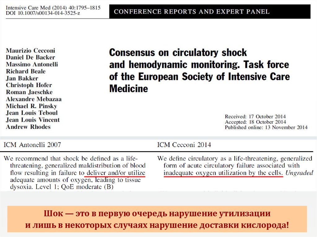 Шок — это в первую очередь нарушение утилизациии лишь в некоторых случаях нарушение доставки кислорода!