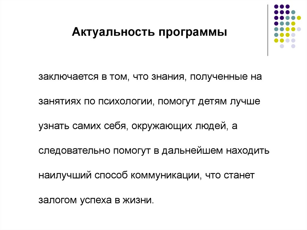 Актуальность программызаключается в том, что знания, полученные на